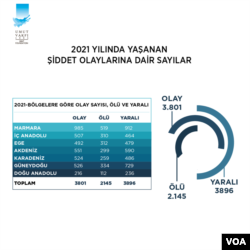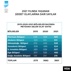 Silahlı şiddet haberlerinin derlenmeye başlandığı 2015’ten bu yana geçen son 7 yılda silahla işlenen şiddet olayları yüzde 75 arttı. 2021’de, 2020 yılından 119 daha fazla şiddet olayı yaşandı. Araştırmada Türkiye’de silahlı şiddetin en çok yaşandığı bölgelere de yer verildi. Her yıl olduğu gibi nüfus yoğunluğunun en yüksek olduğu Marmara bölgesi, 985 silahlı şiddet olayıyla başı çekti. Bir yılda silahlı şiddetin yüzde 21 ile en çok arttığı bölge ise 551 şiddet olayıyla Akdeniz oldu. Ege (492) ve İç Anadolu’da (507) ise bir önceki yıla göre yüzde 6’lık düşüş yaşandı. 2021’de Güneydoğu Anadolu’da 526 ve Karadeniz’de 524 silahlı şiddet olayı görüldü. Olayların en çok yaşandığı iller ise sırasıyla, İstanbul (447), Adana (228), Samsun (222), İzmir (154), Bursa (149), Şanlıurfa (148), Antalya (135), Kocaeli (133), Konya (117) ve Diyarbakır (110) oldu.