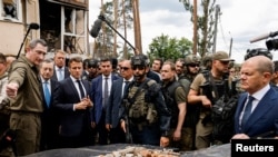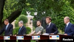 Fransa Cumhurbaşkanı Emmanuel Macron, İtalya Başbakanı Mario Draghi, Almanya Başbakanı Olaf Scholz ve Romanya Cumhurbaşkanı Klaus Iohannis, savaşın başlamasından bu yana Ukrayna sınırları dışına çıkmayan Cumhurbaşkanı Volodimir Zelenski tarafından karşılandı.