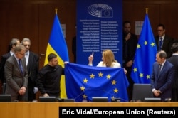 Kazanan bir AB'nin üyesi olmak istediklerini yineleyen Ukrayna liderinin sözleri ayakta alkışlandı.