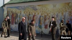 Sosyal medyaya yansıyan görüntülerde Biden, Ukrayna Cumhurbaşkanı Volodimir Zelenski ile yürürken ve şehirdeki Mykhailivska meydanında bulunan anıta çelenk bırakırken görülüyor.