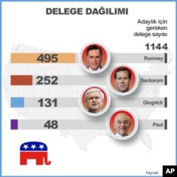 Önseçim sonuçlarına göre Cumhuriyetçi Parti'nin adaylığını kazanmak için 1144 delegenin desteği gerekiyor. Mitt Romney şu ana kadar 400'ün üzerinde delege çıkardı.
