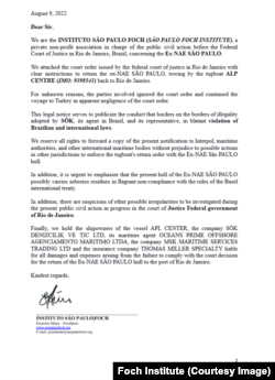 Mektupta, federal mahkemenin 4 Ağustos’ta yani gemi henüz Brezilya karasularındayken hakkında ihtiyati tedbir kararı çıkarılmasına rağmen Hollanda bayrağı taşıyan Alp Center (IMO: 9398541) römorkörü tarafından çekilen geminin yoluna devam etmesinin mahkeme kararının açıktan ihlali olduğu görüşü dile getiriliyor.