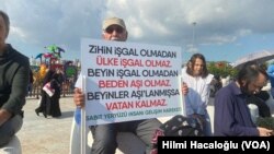 Kemal Koçak’ın hazırladığı ‘‘zihin işgal olmadan ülke işgal olmaz; beyin işgal olmadan beden aşı olmaz; beyinler aşılanmışsa beden kalmaz’’ pankartını taşıyan Erol Avdaş ise meydandaki birçokları gibi 18 aydır Türkiye’yi dünyayı etkileyen COVID-19 salgının pandemi değil ‘‘plan-demi’’ olduğu görüşünde.
