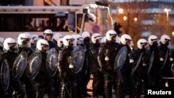 Protestocular, çöp bidonlarını ateşe verdi, polise havai fişekler, sopalar fırlattı.