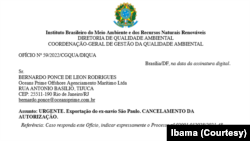 IBAMA tarafından 30 Ağustos’ta, Brezilyalı ihracatçı şirket Oceans Prime Denizcilik Acentesi’ne gönderilen belgenin, Türk makamların gemiye verdiği koşullu onayın iptali üzerine hazırlandığı belirtiliyor.