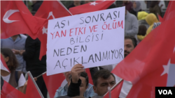 Mitinge katılanlar “Turiste bulaşmayan virüs”, “Aşı mı sizi koruyor, siz mi aşıyı”, “Konserde bulaş yok, camide bulaş var”, “Aşı sonrası yan etki ve ölüm bilgisi neden açıklanmıyor”, “Kobay değiliz insanız” yazılı pankartlar ve Türk bayrakları taşıdı.