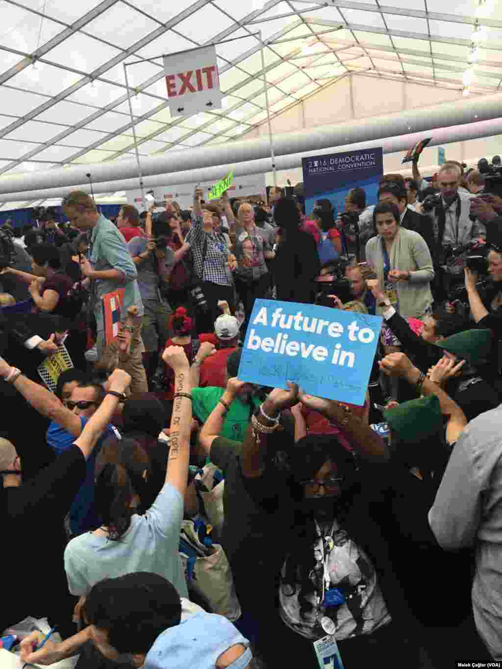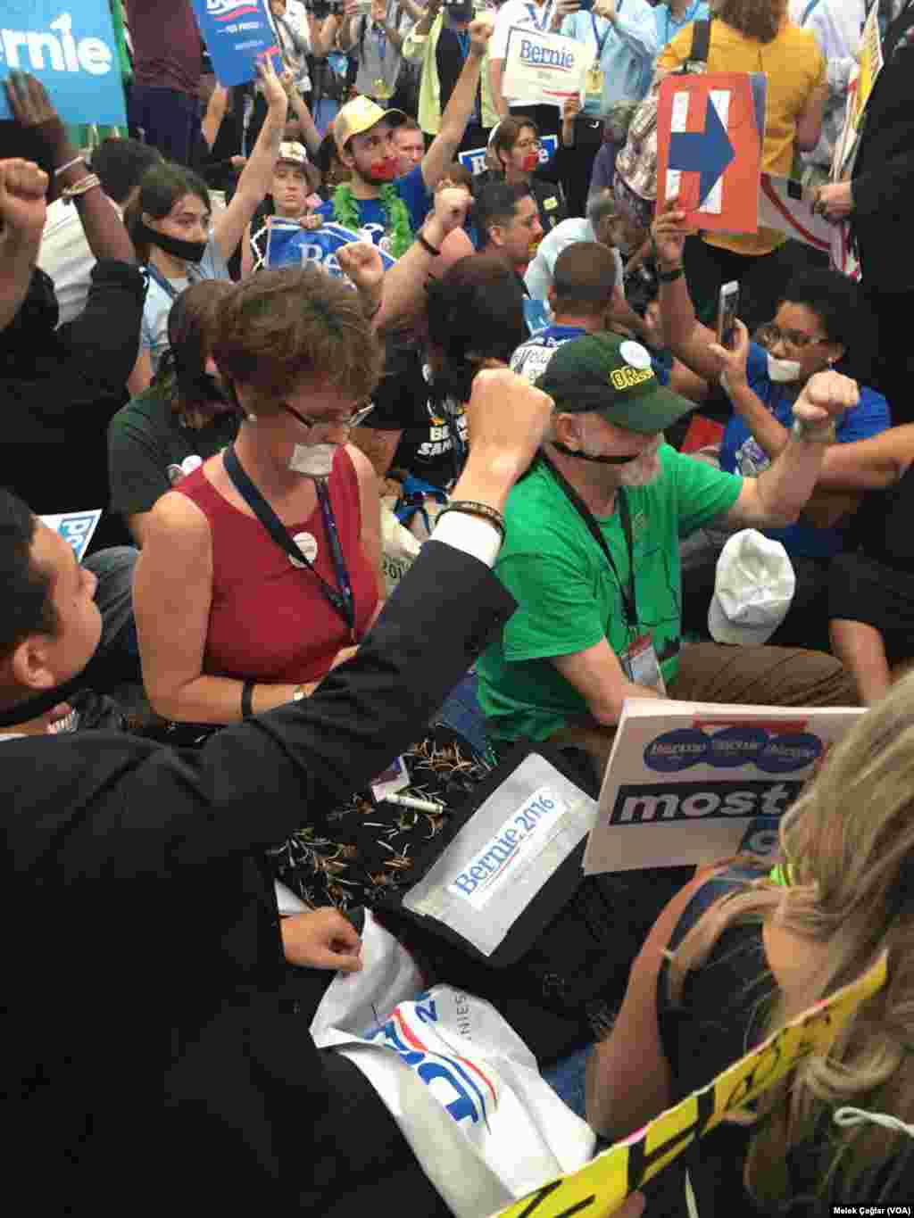 Hillary Clinton'ın kurultayda Demokrat Parti adayı olarak ilan edilmesinden kısa süre sonra bazı Bernie Sanders destekçileri, kurultayı takip eden gazetecilerin bulunduğu medya çadırında oturma eylemi düzenlediler. Ağızlarını bantlarla kapatan Sanders taraftarları sessiz gösterilerini sürdürürken, polis güvenlik önlemleri aldı, medya çadırına giriş-çıkışları kapattı. Girişlerin kapatılması üzerine diğer Sanders destekçileri kurultayın yapıldığı kongre merkeziyle medya çadırı arasındaki alanı doldurdular. İçerdeki göstericilerle dışarıda kalan göstericiler camların ardından birbirlerine destek verdiler