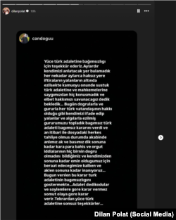 Eşinin tahliye haberini Youtube’da 177 milyon kez izlenen “Enerci” adlı şarkısıyla kutlayan Dilan Polat, “Devletimiz sağ olsun, çok mutluyuz” dedi.