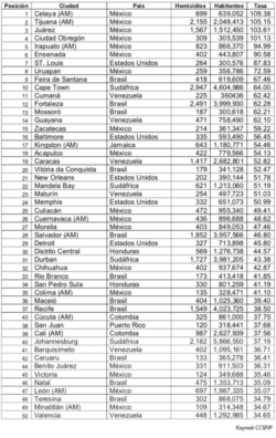 Cinayet oranı ortalaması 67,09 olan Meksika’yı ilk onda 1, ilk ellide 11 şehri bulunan Brezilya izlerken, son yılların en ağır sosyo-ekonomik krizlerinden birini yaşayan Venezuela’nın ilk ellide 5 şehri bulunuyor ve Venezuelalı sivil toplum örgütleri kasten adam öldürme vakalarının en az yüzde 35’inin güvenlik güçleri tarafından gerçekleştirildiğini bildiriyor.