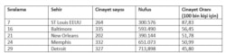 Raporda kentler, şehir nüfusunun bir yıl boyunca işlenen cinayet sayısına oranı arttıkça daha tehlikeli olarak değerlendiriliyor ve sıralama her 100 bin kişiye düşen kasıtlı adam öldürme sayısına karşılık gelen ‘cinayet oranı’ hesabına göre yapılıyor.