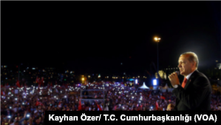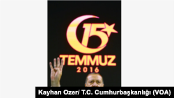 “Geçen yıl bugün bu saatlerde burada tam bu noktada bir ihanet girişimi başlamıştı” diyen Erdoğan, Türkiye'nin FETÖ ihanet çetesinin aracılığı ile bir saldırıya bir işgal girişimine maruz kaldığını ve bunu gören milletin hemen harekete geçtiğini söyledi.