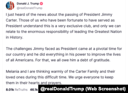 20 Ocak’ta göreve başlayacak olan Başkan Donald Trump da kendi sosyal medya platformu Truth Social'da, “Jimmy'nin Başkan olarak karşılaştığı zorluklar ülkemiz için çok önemli bir döneme denk geldi ve o tüm Amerikalılar’ın yaşamlarını iyileştirmek için elinden gelen her şeyi yaptı. Bunun için hepimiz ona minnet borçluyuz” ifadelerini kullandı.