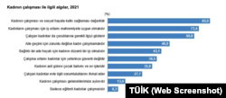 Bu tabloya rağmen katılımcılar tarafından kadının çalışması ve sosyal hayata katılması da önemli bulundu. “Kadının çalışması ve sosyal hayata katkı sağlamasının değerli olduğunu” düşünenlerin oranı yüzde 82,6 oldu. Araştırmaya katılanların yüzde 49,9’u ise “aile geçimi için zorunlu değilse kadın çalışmamalıdır”, yüzde 35,8’i “kadının asli görevinin çocuk bakımı ve ev işleridir” dedi.