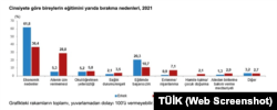 Araştırmada boşanma nedenleri incelendiğindeyse, en önemli neden sorumsuz ve ilgisiz davranma oldu (yüzde 32,2). Bunu yüzde 14,1 ile aldatma, yüzde 9,8 ile evin ekonomik olarak geçimini sağlayamama ve yüzde 8,1 ile dayak/kötü muamele izledi.