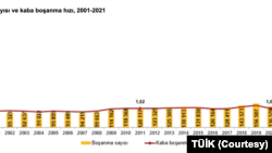 Boşanan çiftlerin sayısı ise bir önceki yıla göre yüzde 27 arttı. 2020 yılında boşanan çiftlerin sayısı 136 bin 570 iken 2021 yılında 174 bin 85 oldu. Bin nüfus başına düşen boşanma sayısını ifade eden kaba boşanma hızı 2021 yılında binde 2,07 olarak gerçekleşti. Boşanmaların yaklaşık üçte biri (yüzde 33,6) evliliğin ilk beş yılı içinde gerçekleşti. Kesinleşen boşanma davaları sonucunda 2021 yılında 165 bin 937 çocuk velayete verildi.