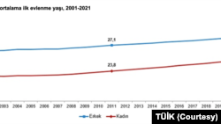 Türkiye’de ilk kez evlenen çiftlerin ortalama yaşı da yükselmeye devam etti. Ortalama ilk evlenme yaşı 2021 yılında erkeklerde 28,1 iken kadınlarda 25,4 oldu. Erkek ile kadın arasındaki ortalama ilk evlenme yaş farkı ise 2,7 yaş olarak gerçekleşti.