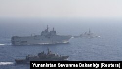 Yunan savunma kaynakları, fırkateyn ve jetlerin Perşembe günü erken saatlerde Yunan güçleriyle ortak manevralar gerçekleştirmek üzere Girit'e ulaştıklarını açıkladı.