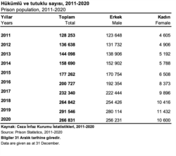 Türkiye, Avrupa Konseyi’nin 2020 Cezaevi İstatistik Raporu'na (SPACE) göre, Avrupa'da nüfusa oranla en çok tutuklu ve mahkumun cezaevlerinde bulunduğu ülke. Avrupa'daki mahkum sayısının 2013 yılından bu yana düşmeye devam etmesine karşın cezaevindeki mahkum sayısı en fazla olan ülkeler arasında Rusya, Türkiye ve Gürcistan ilk üç sırayı oluşturuyor. TÜİK verilerine göre, 2020’de Türkiye'de ceza ehliyeti yaşı olan 12 ve yukarı yaştaki her 100 bin kişiden 390'ı ceza infaz kurumuna girdi. Bu oran 2011 yılından bu yana artışta.