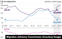 2015 Haziran’ında Brexit referandumunun ayrılık yönünde çıkmasıyla Avrupa ülkelerinden gelenlerin sayısının 175 bin kişi civarında durduğu, 2016’da ise keskin bir düşüşle 125 bin kişi seviyesine indiği görülmekte. 2017-2018 yılında gelen sayısı 36 bin kişi daha azalarak 90 bine kadar düşüyor. Bunlar sadece AB’den gelenlerin rakamları. Onlar azaldıkça dünyanın başka ülkelerinden gelenlerin sayısında tersine bir artış var. Bu grafik İngiltere istatistik kurumunun yayınladığı rakamlarla elde edilmiş.