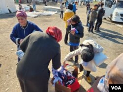 Araçlar giysi yardımı kolilerini çadırkent girişine bırakıp gittiği için bu alanda yerlere saçılmış giysilerden oluşan kötü bir görüntü var.
