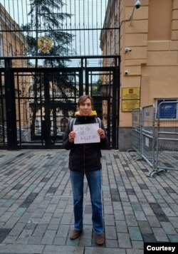 Üzerinde "Putin katildir" yazan bir kağıdı açan Svetlana Makhokhei ve Türk kocası da gözaltına alınanlar arasındaydı.