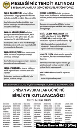 5 Nisan Avukatlar Günü’nde İzmir Barosu’na bağlı avukatlar, mesleğe yönelik tüm saldırı ve engellemelere karşı taleplerini dile getirmek amacıyla yürüyüş düzenledi, basın açıklaması yaptı. İzmir Adliyesi ana binası önünde “Savunma yürüyor” pankartı arkasında toplanan avukatlar adliye ek binasına kadar yürüdü.