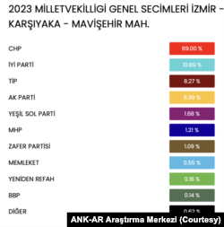 ANK-AR Araştırma Merkezi’nin Yüksek Seçim Kurulu’ndan (YSK) derlediği verilere göre, İzmir’de 14 Mayıs’taki son genel seçimlerde Mavişehir’de CHP yüzde 69 oy alırken AK Parti’nin oyu yüzde 6,39’da kaldı.
