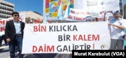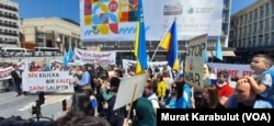 Türkiye, Ukrayna ve Kırım Tatar milli marşlarının okunduğu mitingde Tuncer Kalkay, Kırım Tatar Teşkilatları Platformu adına basın bildirisini okudu.