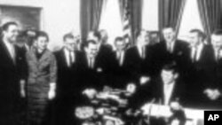 Kennedy ilk gönüllü grubunu Afrika’ya gitmelerinden önce Beyaz Saray’da ağırladı: “Bunu ülkemiz adına ve adından da anlaşıldığı gibi barış adına yapacak olmanız bütün Amerikalılar’ı gururlandırmalı, herkes sizleri taktir etmeli.”