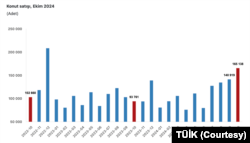 TÜİK’in açıkladığı konut satış istatistiklerine göre, geçen ay en yüksek Ekim rakamı görülürken, bundan önceki zirve, 2018 Ekim'de 146 bin 536 adet olarak gerçekleşmişti. Bu yıl Nisan ayında 75 bin adete kadar düşen konut satışları, mevduat ve kredi faizlerinin yüksek olmasına rağmen Temmuz ayından bu yana artmaya devam ediyor.