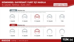 2021 yılının ilk çeyreğinde yüzde 7,4 büyüyen Türkiye, ikinci çeyrekte bir önceki yıldan gelen baz etkisiyle yüzde 22, üçüncü çeyrekte ise yüzde 7,4’yi yakalayan bir büyüme gerçekleştirdi. Türkiye, dördüncü çeyrekte de yüzde 3 büyüdüğü takdirde Adalet ve Kalkınma Partisi döneminde ilk kez bir yılı yüzde 10’dan fazla büyümeyle kapatacak.
