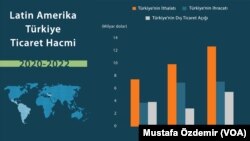 TÜİK verilerine göre, Latin Amerika ile Türkiye arasında geçtiğimiz yıl 19,7 milyar dolarlık ticaret hacmiyle rekor seviyeye ulaşıldı. Bölgeyle ticaretinde 5,3 milyar dolarlık dış ticaret açığı veren Türkiye'nin, Latin Amerika’daki en büyük ticaret ortakları Brezilya, Kolombiya, Meksika ve Venezuela.