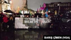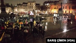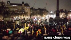 Sosyal medya üzerinden Türkçe, Kürtçe ve İngilizce olarak haberleşen ve organize olan 50 kişiden biraz fazla kalabalık bir grup Pazar akşamı Trafalgar meydanında buluşup ellerinde PKK ile YPG flamalarıyla ve Abdullah Öcalan resimleriyle İngiltere’yi Türkiye’ye karşı tavır almaya çağırdı.