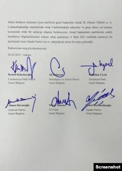 Yayınlanan ortak açıklamada "Millet İttifakını oluşturan siyasi partilerin genel başkanları olarak 28. Dönem TBMM ve 13. Cumhurbaşkanlığı seçimlerinde ortak Cumhurbaşkanı adayımız ve geçiş süreci yol haritası konusunda ortak bir anlayışa ulaşmış bulunuyoruz. Genel başkanların partilerinin yetkili kurullarını bilgilendirmeleri sonrası nihai açıklamayı 6 Mart 2023 tarihinde kamuoyu ile paylaşmak üzere Saadet Partisi’nin ev sahipliğinde tekrar bir araya geleceğiz" denildi.