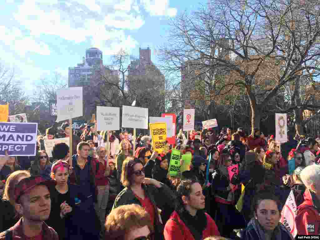 Yüzlerce New Yorklu Kadın 8 mart dünya kadınlar günü dolayısıyla Central Park’ın önünde toplandı. “Kadınsız birgün” sloganı ile bazı kadınlar işe gitmezken, gösteriye katılan kadınların çoğu kırmızı renk kıyafetler giydi