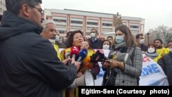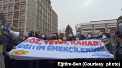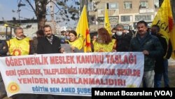Öğretmenlik Meslek Kanunu Tasarısı’nın geri çekilmesini isteyen Eğitim-Sen Üyeleri Diyarbakır’da da basın açıklaması yaptı. Yenişehir İlçesindeki Hazal parkta toplanan Eğitim-Sen Üyeleri adına konuşan Eğitim-Sen 1 Nolu Şube Eşbaşkanı Emine Akşahin, yasayla ilgili yeni bir düzenleme yapılması çağrısında bulundu. Bugün TBMM’de görüşülecek yasanın geri çekilmesini isteyen Akşahin, “Eğitim-Sen olarak yaptığımız sayısız basın açıklaması, işyerlerimizde gerçekleştirdiğimiz toplantılar, eylem ve etkinliklerde defalarca dile getirdiğimiz talebimizi bugün Türkiye’nin dört bir yanında olduğu gibi, burada sizlerin huzurunda bir kez daha tekrarlamak istiyoruz. Eğitim emekçilerinin bilgisi ve önerileri dışında hazırlanan, onların temel haklarını ve taleplerini içermeyen Öğretmenlik Meslek Kanunu Tasarısı derhal geri çekilmelidir. Bir meslek kanunu hazırlanacaksa Öğretmenlerin Statüsü Tavsiye Kararı temel alınmalı, sadece öğretmenlerin değil tüm eğitim emekçilerin hakları ve taleplerini güvence altına alan yeni bir düzenleme yapılmalıdır” dedi.Açıklamadan sonra VOA Türkçe’nin sorularını yanıtlayan sendika üyesi öğretmenler de yasanın geri çekilmesini istedi. Öğretmenler, yasanın iş barışını bozacağını savunarak, eğitim sendikaları ile görüşülerek yeni bir düzenleme yapılmasını önerdi.