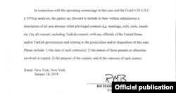 Hakim Richard Berman, 18 Ocak’ta aldığı bir kararla, Rıza Sarraf ve Mehmet Hakan Atilla’nın avukatlarından, geçmişte Türk ve Amerikalı hükümet yetkililerle yaptıkları görüşmeleri, yazışma ve mesajları tarihleriyle ayrıntılı olarak kendisine bildirmelerini istemişti.