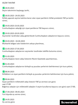Yener, “Bugünkü çalışmamızda 14 Mayıs 2023 tarihinde (Pazar günü) yapılacak Cumhurbaşkanlığı ve 28. Dönem Milletvekilli Seçimleri’nde, seçim takviminin başlangıç tarihi olarak 18 Mart 2023 tarihi belirlenmiştir. Ayrıca yurt içi ve yurt dışında seçmenlerin oy kullanmasına ilişkin ilkelerin belirlenmesi çalışması da devam etmektedir” ifadesini kullandı.