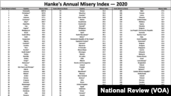 John Hopkins Üniversitesi’nden ekonomist Steve H. Hanke’nin her yıl yayınladığı Dünya Sefalet Endeksi raporunda Venezuela ilk sırada yer aldı. Ülkede 2020 enflasyonu yüzde 3.713, faiz yüzde 37, işsizlik oranı yüzde 50,3 ve ekonomik küçülme yüzde 30,9 olarak hesaplandı.