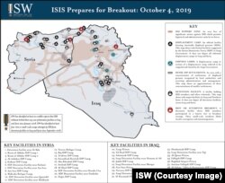 Savaş Araştırmaları Enstitüsü’nün Ekim ayı başında yaptığı “IŞİD Kaçışa Hazırlanıyor” başlıklı haritaya göre, Suriye’de SDG denetiminde IŞİD’lilerin tutulduğu toplam 7 gözaltı merkezi, 3’ü büyük 14 tane kamp bulunuyor.