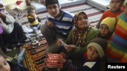 Kasabada yerel İslamcı bir yardım örgütü, yabancı kuruluşların sağladığı yatak ve battaniyeleri sığınmacılara dağıtıyor.