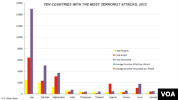 Rapora göre 2013 yılında teröre bağlı şiddeti tetikleyen başlıca unsurun mezhepsel nedenler olduğuna dikkat çekiliyor. Mezhepsel şiddetin yaşandığı ve sivillerin başlıca terör kurbanları arasında bulunduğu ülkeler arasında Suriye, Lübnan ve Pakistan başta gösteriliyor.