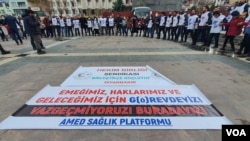 Diyarbakır’da grev yapan sağlık çalışanları Dağkapı meydanında toplandı. Davul zurna eşliğinde halay çeken sağlık çalışanları tepkilerini sloganlarla dile getirdi. Sağlık ve Sosyal Hizmet Emekçileri Sendikası (SES), Diş Hekimleri Odası, Eczacılar Odası ve Mezopotamya Psikologlar İnisiyatifi’nin de destek verdiği eyleme katılan sağlık çalışanları taleplerini VOA Türkçe mikrofonlarına dile getirdi.