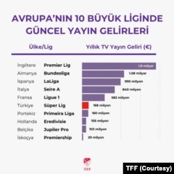 Federasyon, bugün yayınladığı infografikte, Türkiye’nin, Avrupa’nın beş büyük ligi; sırasıyla İngiltere, Almanya, İspanya, İtalya ve Fransa’nın ardından, yayın gelirlerinde altıncı sıraya yükseldiğini açıkladı.