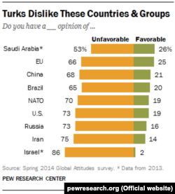 Ancak PEW’u araştırması Türkler’in hoşlanmadıkları ülkelerin Amerika’yla sınırlı olmadığını gösteriyor. Daha doğrusu Türkler hemen hiçbir ülkeden fazla hoşlanmıyor. Türk halkı özellikle yabancı süpergüçleri sevmediği gibi, görüşü sorulanların üçte ikisi veya daha fazlası, Avrupa Birliği, Çin, Brezilya, Rusya, İran ve İsrail’den de hiç hoşlanmadığını söylüyor. Türkler Suudi Arabistan’dan da hoşlanmıyor. Türkler’in % 53’ü ‘Suudi Arabistan’I sevmiyorum’ derken, sadece halkın % 26’sı bu ülkeden hoşlandığını söylüyor. Yine de Suudi Arabistan Türkler’in en çok sevdiği ülke olarak ortaya çıkıyor.