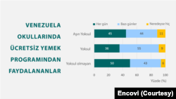 Venezuela’daki çeşitli üniversitelerin birlikte yaptığı Encovi yaşam kalitesi araştırmasına göre her 10 kişiden dördünün ekonomik yetersizliklerden dolayı öğün sayısını düşürmek zorunda kaldığı ülkede, okullarda çocuklara yönelik ücretsiz ve besleyici yemek programlarının öneminin artmasına rağmen yemeklere ayrılan payın azaltılması başta öğretmen ve veliler olmak üzere ciddi eleştirilere neden oluyor.