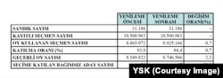 Buna göre; Cumhurbaşkanlığı’nın birinci turunda 14 Mayıs’ta kayıtlı seçmen sayısı 60 milyon 721 bin 745 iken, oy kullanan seçmen sayısı 53 milyon 993 bin 683 oldu. Dolayısıyla seçime katılım oranı yüzde 88.92.